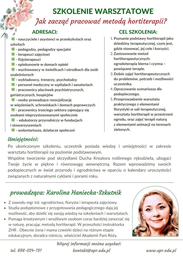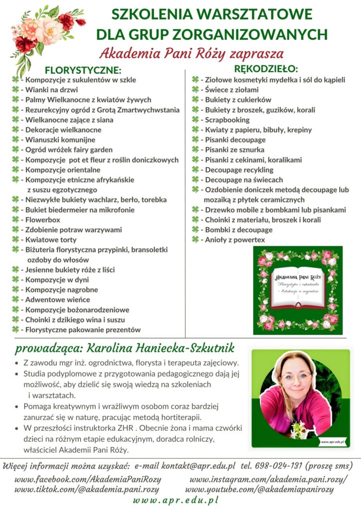 TU POBIERZ TEMATY SZKOLEŃ WARSZTATOWYCH DLA GRUP ZORGANIZOWANYCHOFERTA szkolenia warsztatowe dla grup zorganizowanych www.apr.edu.plPobierzOFERTA SZKOLENIE WARSZTATOWE HORTITERAPIA DLA POCZĄTKUJĄCYCH Pobierz